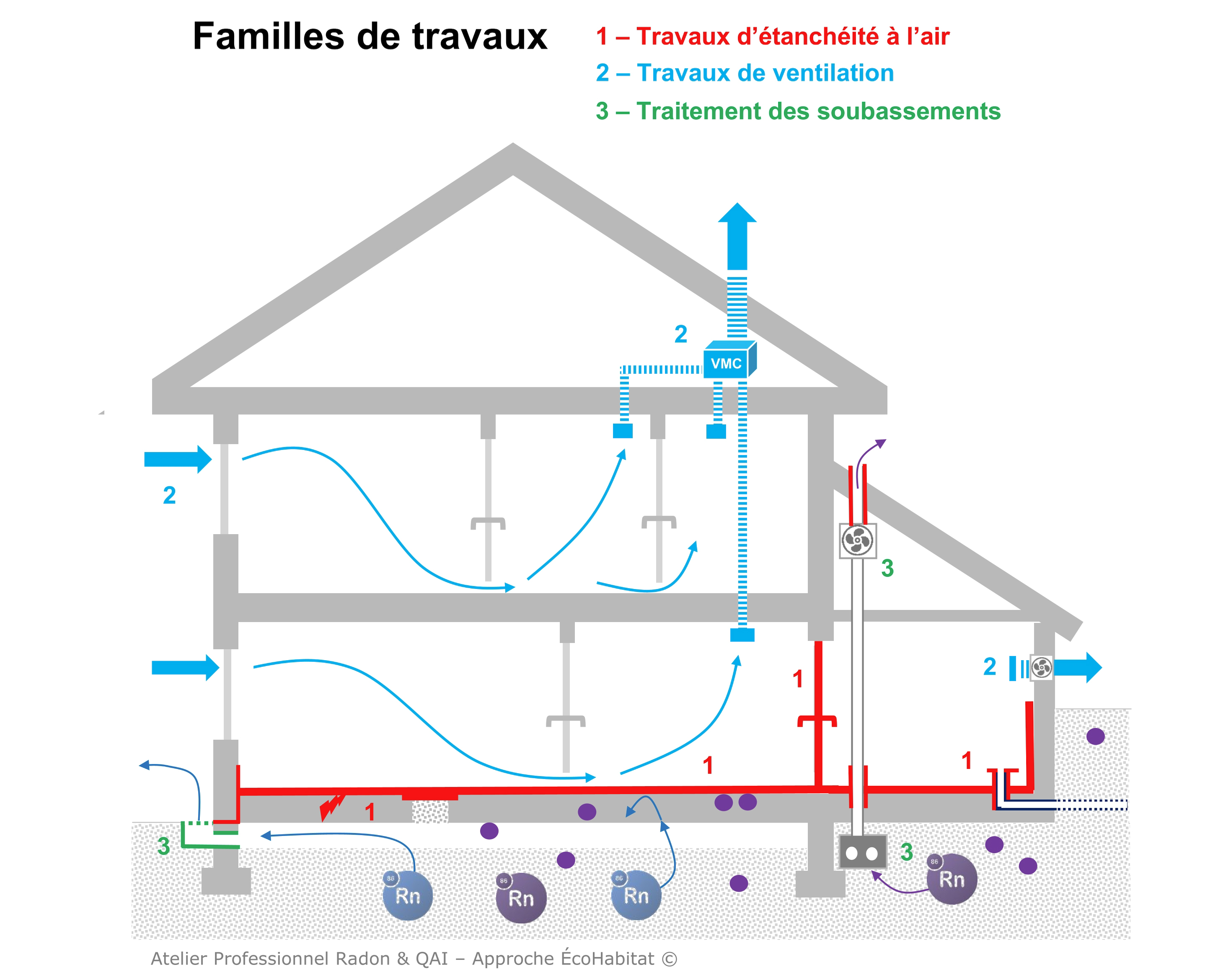 L’objectif est d’assurer un renouvellement d’air permanent et suffisant pour diluer et évacuer l’humidité et les polluants de l’air intérieur (dont le radon).  Le système de ventilation mis en œuvre doit être dimensionné et adapté aux caractéristiques du bâtiment et respecter les exigences réglementaires. Ces travaux sont nécessaires pour maintenir une bonne qualité de l’air intérieur. Pour autant, ils peuvent ne pas suffire en cas de concentration de radon élevée.