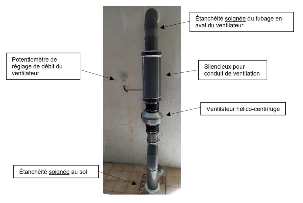 Si le niveau de radon reste ou devient significatif, on raccordera en sortie du réseau un ventilateur d'extraction tout en obstruant (ou réduisant) l'entrée basse du drain. La mise en dépression s'effectuera alors par système actif.