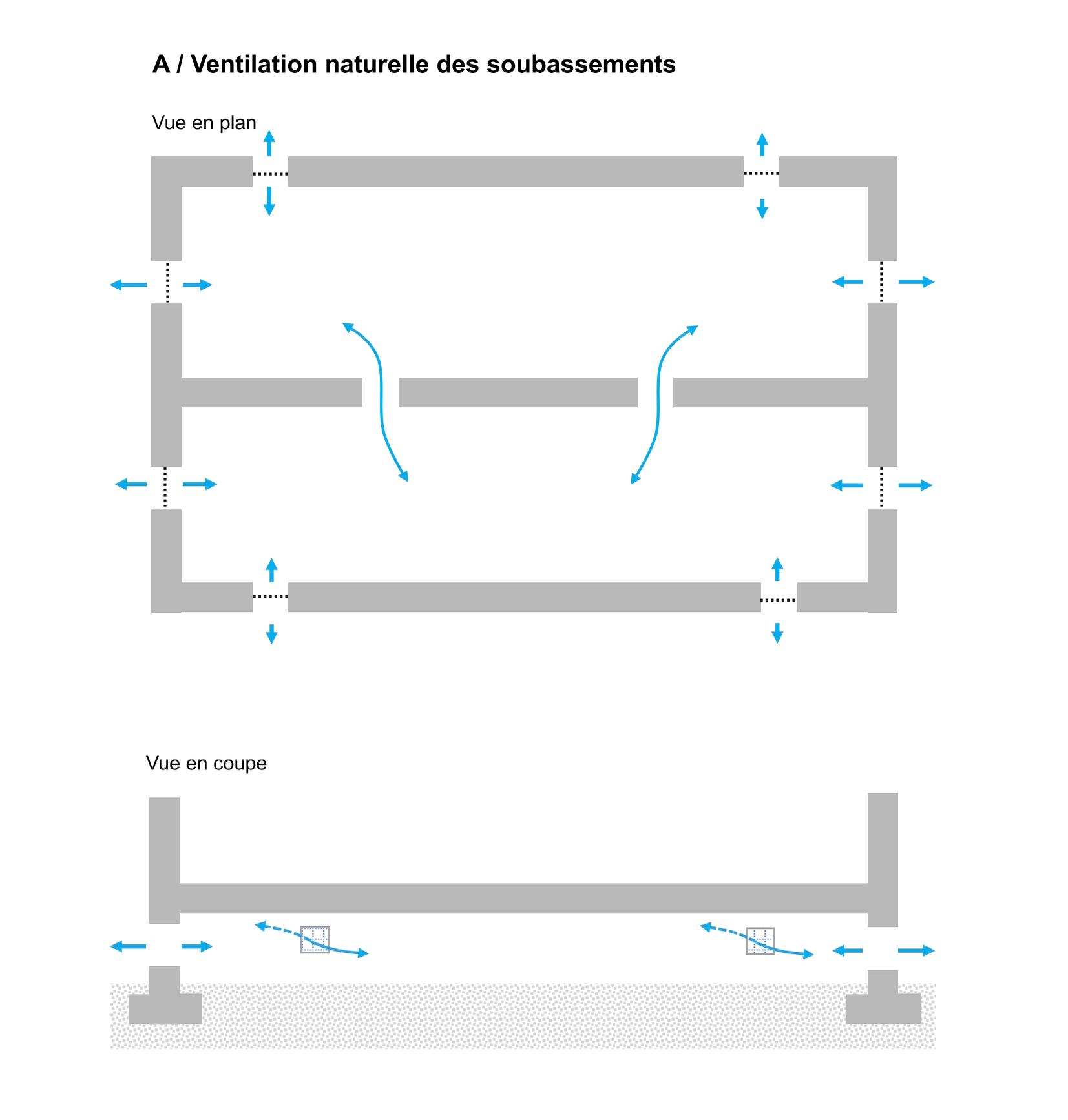 Le renouvellement de l’air peut s’effectuer par ventilation naturelle ou par ventilation mécanique par extraction. La mise en surpression des soubassements est déconseillée.