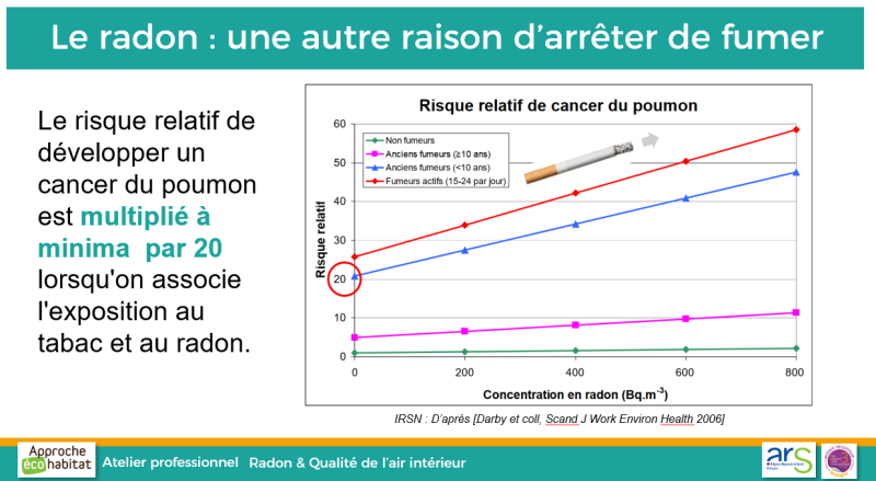 De nombreuses études épidémiologiques ont confirmé la contribution du radon dans la survenue du cancer du poumon, surtout chez les personnes exposées au tabac.